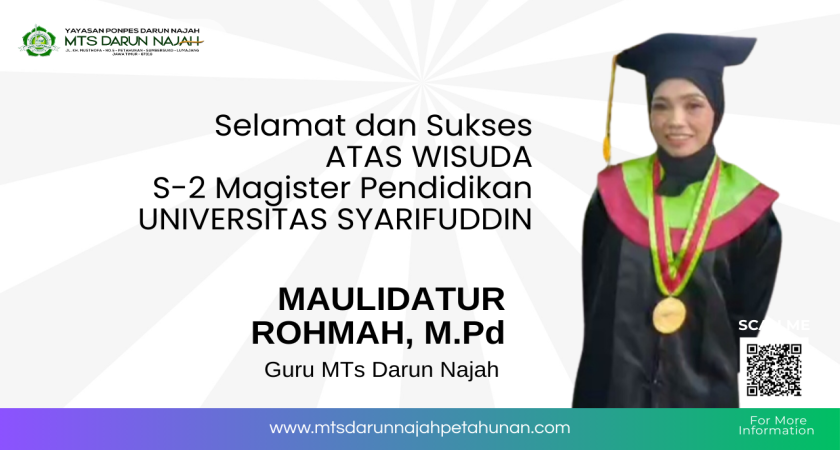 “Selamat dan sukses kepada Ustadzah Maulidatur Rohmah. Semoga ilmu yang diperoleh membawa keberkahan, kemajuan dan melahirkan inovasi pembelajaran di MTs Darun Najah. Prestasi ini menjadi motivasi bagi guru lainnya untuk terus mengembangkan diri,” tuturnya.